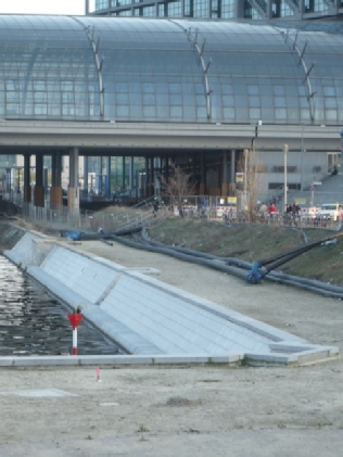 An empty space between the Spree and the Weidendammer Brücke. The buildings in the back are behind the river on the Schiffbauerdamm. (picture: Springer, 2013)